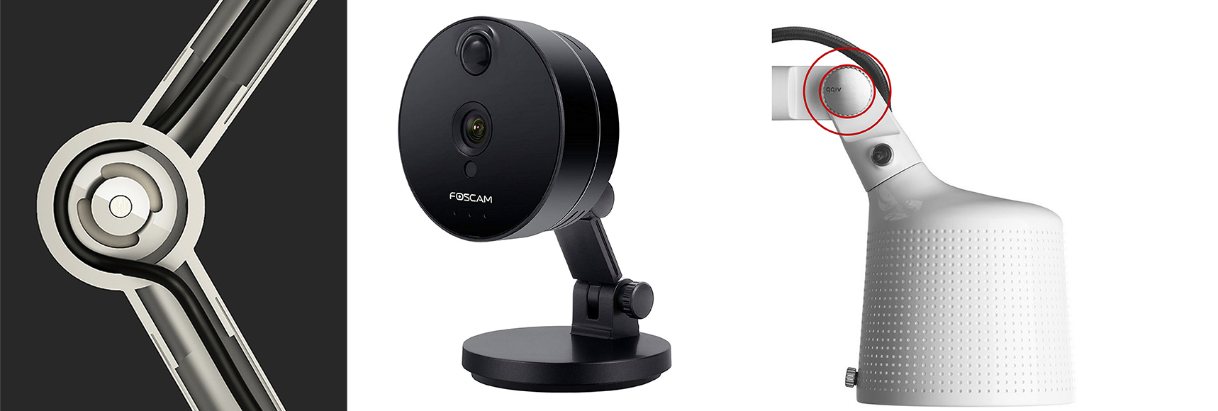 ⑥ 萬向型 通過一種滾珠結構轉動來實現各方位角度的調節,多應用于輕小型產品中,這種滾珠結構一般都會打孔,一來是能夠防止塑料縮水,二來可以方便從中間走線。