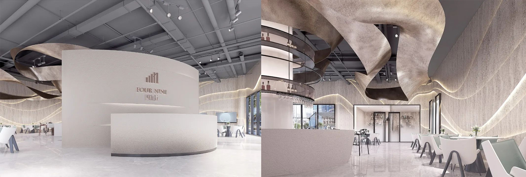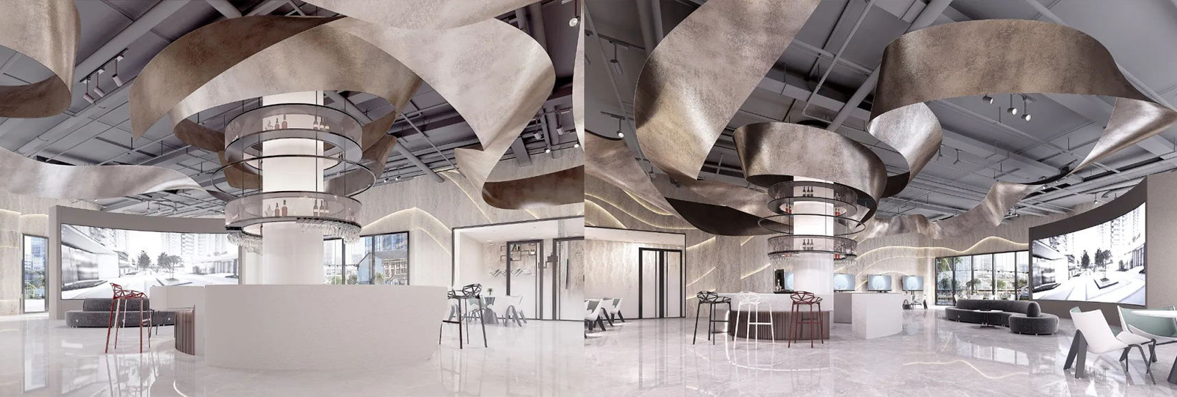 整體界面會將不同的材質、潔面抽象為基本的造型元素,通過造型要素的綜合運用(點、線、面)的變化和對比,形成簡練而豐富的空間內容。